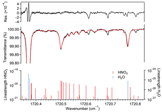 Bottom: ro-vibrational transitions of HNO3 and H2O taken from HITRAN2020 [32]. Middle: measured transmission spectrum (black) of a gas mixture (30 °C, 5 kPa) of ambient air and HNO3-containing air and the associated spectral fit using the Voigt profile (red). The retrieved amount fraction corresponds to 12 ppb HNO3 and 1.6% H2O, respectively. Top: fit residual indicating the quality of the fit (root mean square of the fringe level of ) and the existence of some absorption features that could not be associated with any known transition listed in HITRAN2020.