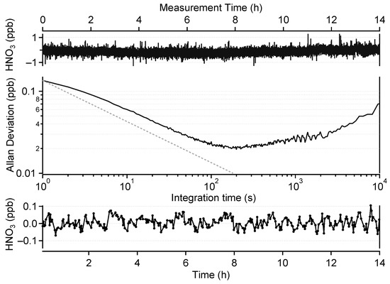 The top panel of Figure 4 shows a 14 h measurement of HNO3-free air under laboratory conditions. We follow this approach to eliminate the influence of the calibration source instability on the measured data. The Allan–Werle deviation plot associated with this time series (middle panel of Figure 4) shows 1 s and best achievable precisions (corresponding to an integration time of 200 s) of 140 ppt and 20 ppt, respectively. This compares well with previously published data. Horii et al. [24] reported a precision between 150 and 200 ppt at a resolution of 1 s with a 210 m OPL multipass cell and reached a precision of 45 ppt at an integration time of 40 s. McManus et al. [39] obtained a 1 s precision of 600 ppt with a 76 m OPL cell. Hence, the precision of our instrument, normalized by the OPL, offers an improvement of at least a factor of 2.