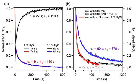 As the sampling line contains multiple elements, it is crucial to identify the most critical part in order to improve the overall response. We start by estimating the response times of the parts of the sampling system that are involved when switching the three-way valve position to perform HNO3 blank measurements. These parts are the MPC, the PFA piping of the ambient and zeroing channels, and the three-way valve itself. For more clarity, this part of the sampling system is designated the “reduced inlet” in the rest of the text. In Figure 5a, the HNO3 signal recorded after a valve position switch, normalized to unity, is shown. The experiment was conducted with an inlet HNO3 amount fraction of about 15 ppb and at 0.1% and 1% H2O. Each trace was obtained by averaging the results of triplicate measurements. The choice to make measurements at low but non-zero humidity was motivated by the need to lock the laser emission frequency even when measuring HNO3-free samples.