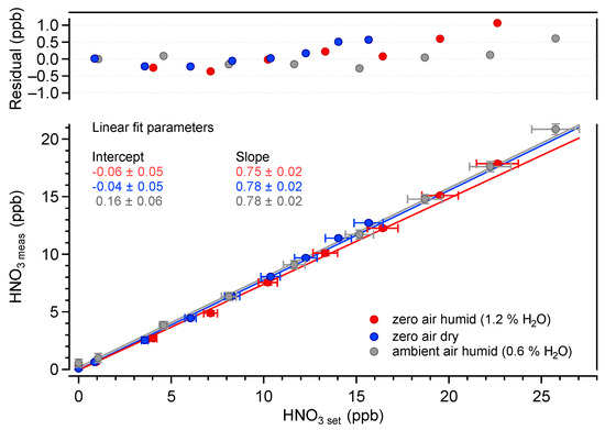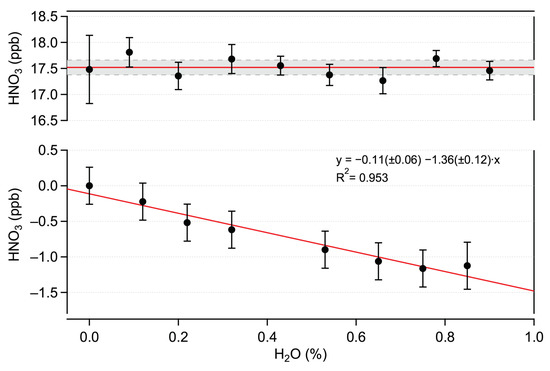 The offset-corrected HNO3 amount fractions measured at different humidity values are shown in the top panel of Figure 7. No significant dependency on the H2O amount fractions is observed. These data demonstrate the absence of the physico-chemical influence of water vapor on HNO3 measurements in the investigated ranges. However, H2O has a notable impact on the zero signal (offset), as shown in the bottom panel of Figure 7. A similar effect has been demonstrated for NO2 measurements in the mid-IR range made using QCLAS (e.g., [28,34]). The magnitude (about 1.40 ppb HNO3/% H2O) of this effect for HNO3 is much stronger (20×) than it is for NO2. This can be due to the higher line strengths of the H2O transitions in the 1720 cm spectral region, by the lower spectral spacing between the HNO3 and H2O lines, and to the lower HNO3 line strength. This biasing effect on ambient air measurements is mitigated by the zero-drift-correction procedure (via HNO3 scrubbing), which makes it possible to obtain a “humid” zero signal (see Section 3.2 for more details).
