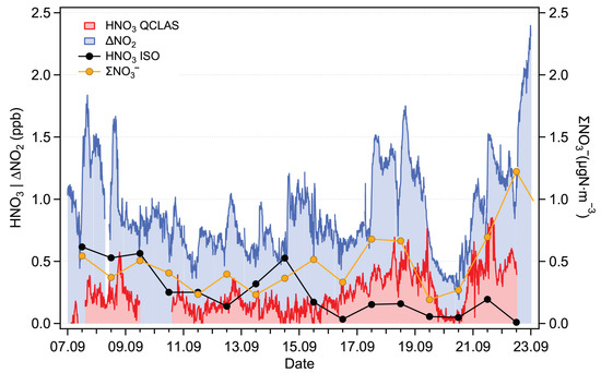 The NO and the QCLAS data show similar trends, especially during the period between 15 and 22 September, when HNO3 amount fractions increase to about 0.8 ppb. The mismatch in the timing may be due to two independent factors: (i) the different response times of the two instruments’ inlets and (ii) the shares of gas phase HNO3 and particle phase NO, which may vary in time and lead to a discrepancy between NO and spectroscopically measured HNO3.