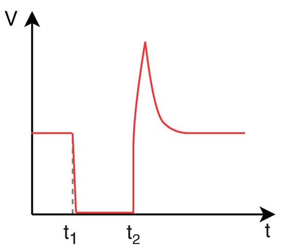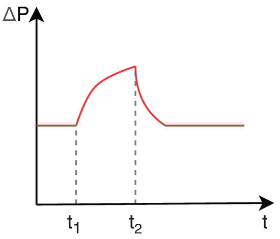 When an obstacle inside the duct prevents the movement of the PIG, the upstream pressure increases significantly in relation to the downstream pressure. The differential pressure () reaches the point where the device can overcome the obstruction, causing a phenomenon known as velocity excursion, which is high velocity (V) reached by the PIG in these conditions. This behavior is illustrated in Figure 5 and Figure 6: the PIG stops at the instant t1 and the differential pressure starts increasing from that very moment; at the instant t2, as the differential pressure becomes high enough to make the PIG overcome the obstacle, the velocity excursion occurs.