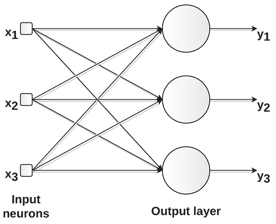 In feed-forward networks, neurons are organized in layers and information flows unidirectionally from the input to the network output (hence the term feed-forward). In single-layer feed-forward networks, there is only one layer of neurons, which constitutes the network’s output. We do not count the input layer since no computation is performed there. Figure 8 shows this type of architecture. Neurons are represented by circles; arrows represent the connections between neurons; , , and are the network inputs; , , and are the outputs.