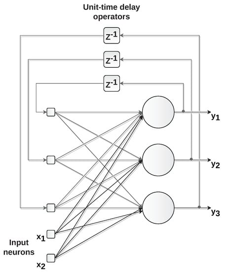 Example of recurrent network with two inputs ( and ) and three outputs (, and ). The time-delayed outputs are used as inputs for feedback on the network.
