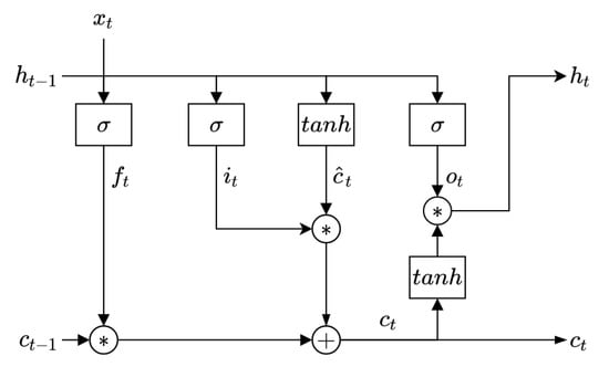 LSTM aims to solve the vanishing gradient, gradient explosion, and insufficient long-term ability problems of traditional recurrent neural networks using controllable gates [32]. These gates are the forget gate , the input gate , and the output gate . The LSTM model is described by the following equations: