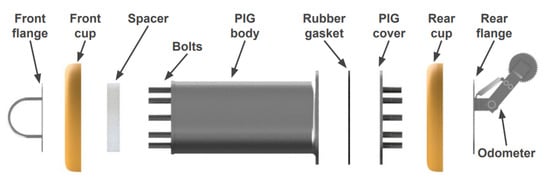 Pipeline inspection gauges (PIGs) are devices that move inside ducts and are capable of performing a range of tasks, from simple cleaning to detailed inspection of pipeline integrity. Figure 1, Figure 2 and Figure 3 show examples of commercial PIGs designed for different purposes.