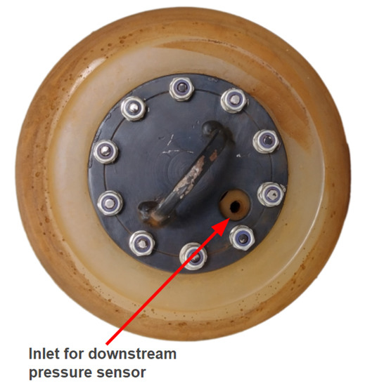 The new PIG body has two polyurethane supports (cups) with a diameter of and a carbon steel body with a diameter of (as in the previous prototype). Figure 15, Figure 16, Figure 17 and Figure 18 show an exploded view of the new PIG, the side view, the front view, and the rear view of the Prototype PIG 2, respectively.