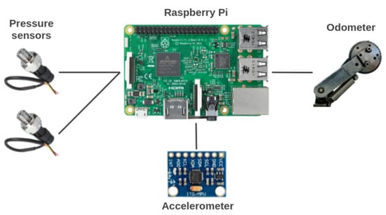 The core element of the embedded system is a Raspberry Pi 3 Model B+, as it is used for the acquisition, storage, and processing of the sensors’ data. The sensors measure the following variables: distance, pressure, and acceleration. Figure 19 shows an overall representation of the system.