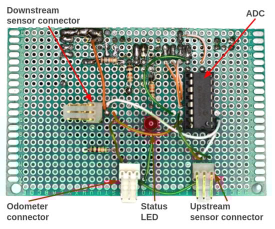 Attached on top of the Raspberry Pi is an auxiliary electronic board that we named Pi Add-On Board, which is an auxiliary board constructed from a universal prototype printed-circuit board that we developed to interface the Raspberry Pi with the pressure sensors and the odometer. Figure 20 and Figure 21 show the top and bottom views of the Add-On Board, respectively.