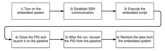 This paper follows previous research undertaken at Universidade Federal do Rio Grande do Norte (UFRN). In [22], pipeline inspection using a device called a pipeline inspection gauge (PIG) was found to be safe and reliable when the PIG operated at low speeds during an inspection. According to [23], pipelines are a key component of an oil and gas supply system, so their maintenance is essential. Among available maintenance techniques, the use of PIGs has been successfully applied in many situations, such as cleaning, product separation and integrity inspection. Finally, the use of neural networks to calculate a PIG’s velocity from the pressure differential was investigated by [12]. The following sections of this article are organized as follows: In Section 2, the research development methodology is described. In Section 3, system implementation is described. In Section 4, the results and discussion are presented. Finally, in Section 5, the conclusions are discussed.