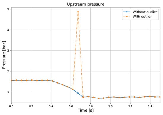 where m is the mass of the PIG, is the velocity of the PIG, A is the cross-sectional area of the PIG rear, is the driving force, represents the friction force, is the differential pressure that acts on the PIG, and is the axial contact force between the PIG and the pipe wall. The dynamic behavior of a PIG inside the pipe is described by its dynamic equation, coupled with the fluid’s governing equations. However, analysis of Equation (3) is sufficient to show that the acceleration of the PIG, and therefore its velocity variation, is directly proportional to the differential pressure. Eventually, some obstacle may impede the PIG motion inside the pipeline, such as debris from the transported product. This situation can lead to the occurrence of so-called velocity excursion, which is explained below.