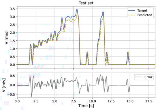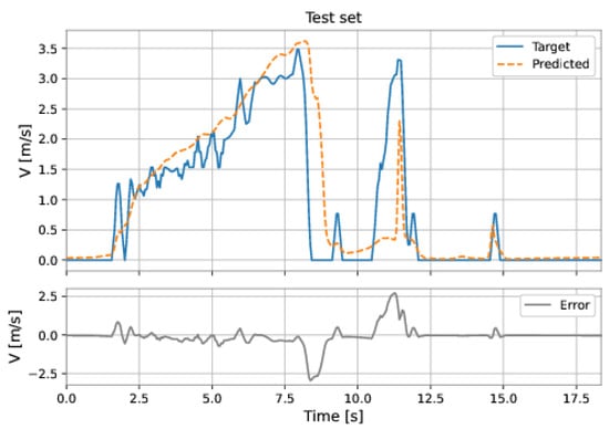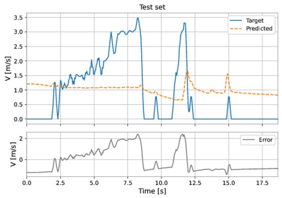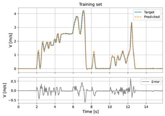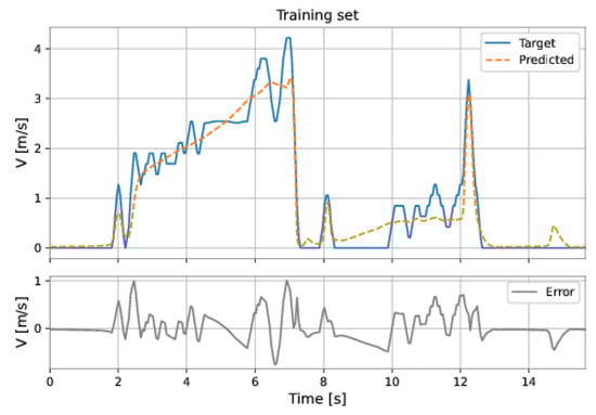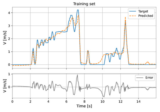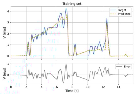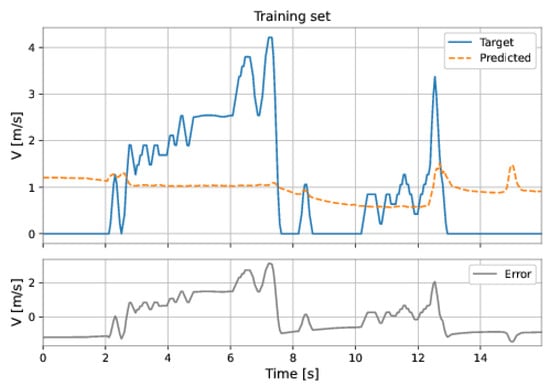 The MLP-NARX model’s features were the differential pressure and total acceleration on the current instant and past instants, as well as the feedback velocity on previous instants. The order of input delay is 1 and the order of output delay is 3. The model presents two hidden layers: 160 neurons in the first hidden layer and 192 neurons in the second hidden layer; the learning rate was equal to . The RMSE on the training set was m/s and on the test set was m/s. Figure 53 and Figure 54 show the results obtained by the model on the training and test sets.