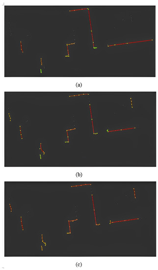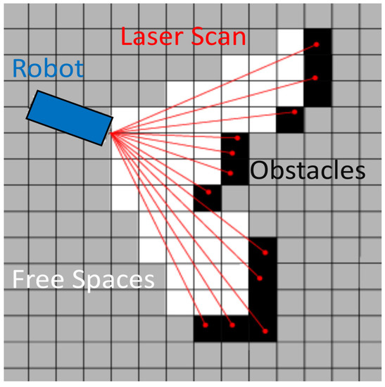 In 2D LIDAR data, point features such as corners are taken as landmarks in the environment. These landmarks can also be used to represent a light-weight map of the environment. However, the structural information of the environment is not contained in the landmarks based on point features. Therefore, the robots are unable to interact with the actual environment by using the point-feature-based map. The occupancy grids used for map representations in [28] produced the structural details of the environment shown in Figure 1, but every grid requires dedicated memory to store each laser data point. The higher the resolution, the more space will be required to save the map.