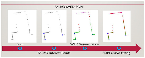 where the number of circular sectors in the polar grid is represented as . Secondly, segmentation SVED and, finally, the active B-spline curve approximation using PDM are employed. This approach can be named FALKO-SVED-PDM. Although, FALKO detects a few suporious interest points, it is fast; therefore, the proposed methodology considerably reduces the overall execution time of the extraction of the B-spline curve. The FALKO-based corner detection algorithm is shown in Algorithm 3.