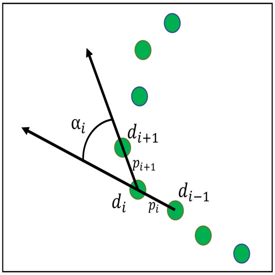 The RPOS-LSBA [10] used a typical approach involving B-spline extraction, which involved the segmentation of the laser scan and then B-spline curve fitting on the segments. In the segmentation step, it employed the relative position and orientation-based segmentation RPOS, which is based on the relative position of and orientation of the two consecutive scan data points, as shown in Figure 3. As segmentation relies on the geometrical (angle and distance) property of the two very next neighboring data points, therefore, a distant point from the neighbors not only creates a new segment but also limits the upcoming neighbor in becoming a part of a segment rather than isolating it. This increases wasted data points. Segments containing less than five data points are considered wasted. The second step is the application of the least-square solution [10] to the segments obtained in RPOS to obtain a B-spline approximation. It is named least square B-spline approximation LSBA. This B-spline feature extraction approach not only increases wasted data points but also lacks a representation of stable points (corners) in the scan. The B-spline feature extraction based on RPOS-LSBA is presented in Algorithm 1.