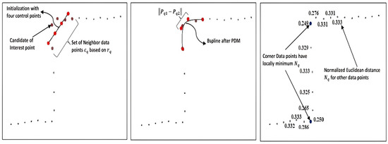 Another method for B-spline feature extraction was presented in [3]. In this approach, an additional step of corner detection was proposed. Firstly, the stable and state-of-the-art B-spline-based interest point detector BID [3] was used for corner detection, as shown in Figure 6. Roughly, a set of a uniform number of neighbor data points is acquired using radius . The clamped and uniform quadratic B-spline curve is initialized with four control points evenly spaced along the axis defined by the largest eigenvector of the covariance matrix of , as shown in red color in Figure 6 (left). Then, the point distance minimization (PDM) method is used to estimate the shape specified by the data points, as in Figure 6 (middle). Finally, the inverse of the normalized Euclidean distance, , among two median control points, and , of the estimated curve, , is taken as the measure of corner occurrence as in Figure 6 (right).