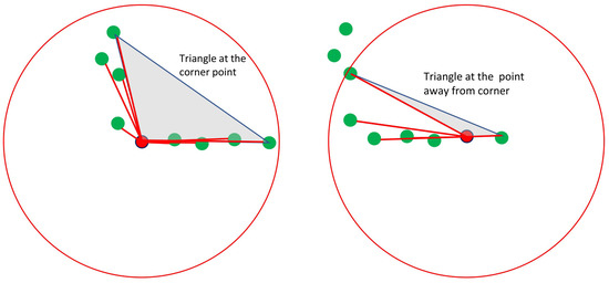 The B-spline-based interest point or corner detection is a computationally very expensive and time-consuming approach. Therefore, in this section, we proposed to use the fast adaptive laser keypoint orientation-invariant FALKO [2] for corner detection. It manipulates the simple idea of edge crossing in 2D range data, as shown in Figure 7, which makes it faster. After finding the potential corner candidates based on the minimum number of neighbors (cardinality) on each side, they are evaluated geometrically (by measuring the height of the triangle as in Figure 7) to obtain a rough approximation of the corner. Then, for each candidate point, a cornerness score is computed.