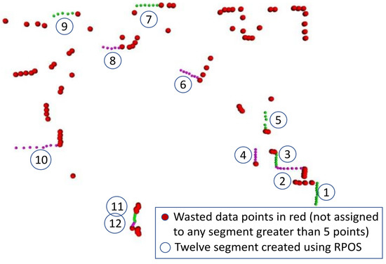 The relative position and orientation-based segmentation RPOS approach with red marks representing wasted datapoints, which are not part of any segment in the scan. A total of 12 green and purple segments were created by this approach. The green and purple colors are used to show the data points of two consecutive segments.