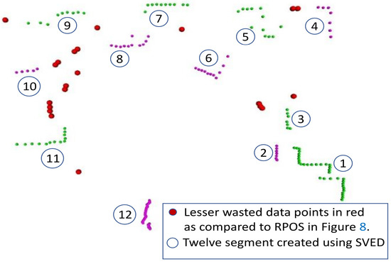 Figure 8 and Figure 9 show the segmentation results of RPOS and SVED approaches, respectivey. The noisy scan was taken from the Intel data set. For the same scan, RPOS produces a lot more wasted data points (red markers), as shown in Figure 6, whereas SVED produce few wasted data points (red markers), as shown in Figure 9. The green and purple markers are shown to represent two separate and consecutive segments. The wasted data points will not be used in the representation of B-splines; therefore, it will be taken as empty space in the environment.