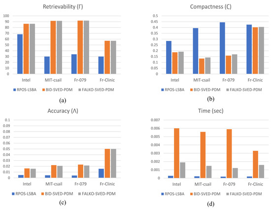 In all four data sets, the state-of-the-art [3] approach results in two outstanding metrics: retrievability and compactness; however [3], they have very poor execution times. The bar graph demonstrates that our proposed approach’s performance significantly improved in terms of execution times when compared with the state-of-the-art approach [3], as shown in Figure 12d. In terms of retrievability and compactness, the proposed approach’s performance is comparable with the state-of-the-art method and significantly better than the RPOS-LSBA. However, the performance of FALKO-SVED-PDM and BID-SVED-PDM in the approximation error (accuracy) is slightly low but within an acceptable range.