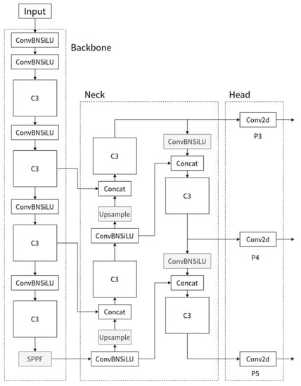 YOLOv5 is one of the widely used object detection networks, which has achieved good results in various industrial problems by virtue of high detection accuracy and fast inference. YOLOv5 is similar to the network structure of YOLO series, Figure 1 shows the YOLOv5 network structure, which consists of an input layer (Input), a backbone feature extraction network (Backbone), a feature fusion layer (Neck), and output layer (Head). Among them, input is a three-channel RGB image with an image size of 640 × 640 × 3, and mosaic data enhancement is used to enrich the detection target image and reduce the model’s dependence on batch size. Backbone is new CSP-Darknet53 which uses BottleNet structure for feature extraction. New CSP-Darknet53 mainly consists of C3 and SPPF structures. The C3 module, by improving the CSP module used in the YOLOv4 [20] model, enhances the ability of model to capture features. The SPPF structure replaces the Spatial Pyramid Pooling (SPP) [21] structure to improve the computational speed of the model. Neck is a structure combining Feature Pyramid Network (FPN) and Path Aggregation Network [22] (PAN), which fuses the semantic information extracted by the deep network with the location information extracted by the shallow network. At the same time, feature fusion is performed between Backbone and Neck to enable the model to obtain more abundant feature information. Head has three detectors to predict the results for different size image features.