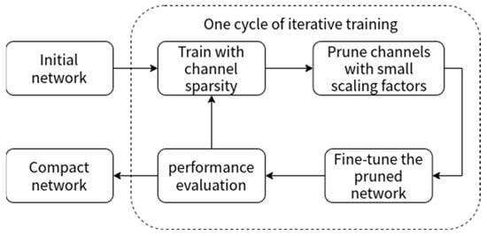 Model compression methods generally include the main steps of sparse training and channel pruning. The purpose of sparse training is to make the weights of unimportant channels converge to 0, thus preserving important information on a small number of channels [23]. As the weights of most channels converge to 0, the network becomes increasingly sparse, usually by using the Batch Normalization (BN) layer [24], which is used extensively in convolutional neural networks. Channel pruning is used to obtain a lightweight model by setting a suitable threshold for the weight of the model channels, and then cropping out the channels with weights less than the threshold [25], and finally fine-tuning the training so that the accuracy of the pruned model is improved [26]. By iterating the above process until the accuracy of the model meets the application requirements, the process is shown in Figure 2.