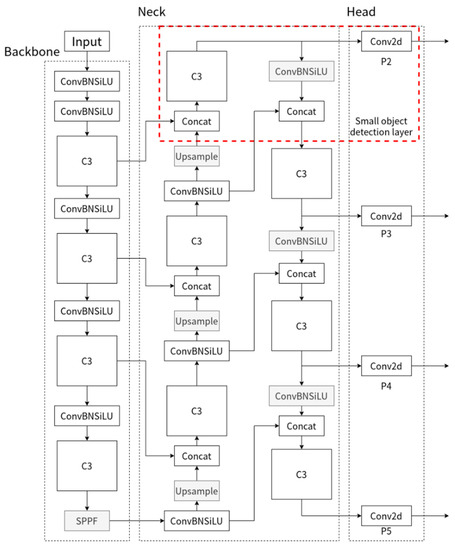 However, considering that the UAV image size is usually above 1000 × 1000 pixels, the proportion of pedestrian targets is generally small, and the receptive field of 8 × 8 is difficult to express small target pedestrian features. To enhance the detection capability of the network for small target pedestrians without expanding the resolution of the input image, a detection layer for small targets is added. As shown in Figure 3, a channel to Neck is added in the first C3 module of Backbone to fuse with the bottom features after up-sampling to obtain more semantic information, which becomes an independent P2 small-target detection head in Head after a C3 module extracts features for output. In the case that the input image is 640 × 640 size, the feature map size of this detection head is 160 × 160, and each feature image element corresponds to the perceptual field of 4 × 4 of the input image, which facilitates the detection of smaller targets. Meanwhile, this channel in the PAN structure provides more position information to the P3, P4, and P5 detection heads by down-sampling to enhance the overall prediction accuracy of the network.