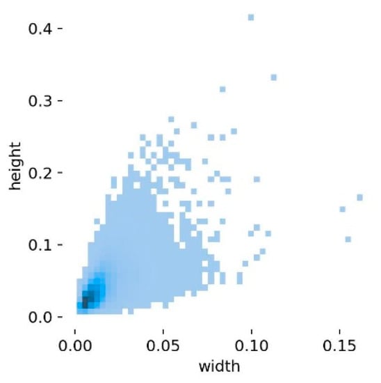 The experimental data for pedestrian detection were obtained from the VisDrone public dataset [27], which was collected and created by the AISKYEYE team at the Machine Learning and Data Mining Laboratory of Tianjin University. The dataset covers different scenarios under neighborhoods and suburbs in 14 cities in China, covering diverse weather and lighting conditions, including people, pedestrians, cars, vans, buses, trucks, motorcycles, and other targets in a total of ten. The dataset consists of 263 videos and 10,209 still images, of which the VisDrone-DET dataset for image object detection is divided into 6471 training sets, 548 validation sets, and 3190 test sets. In this experiment, images with pedestrian annotations (as shown in Figure 4) are selected from typical scenes such as urban, suburban, night, and daytime, and the data with the problem of missing markers are eliminated, and the two types of targets, pedestrians and people, are combined into one category of pedestrians to form an experimental dataset with 4634 pedestrian feature-rich images. The dataset is divided into training, validation, and test sets in the ratio of 7:2:1, which is used in this experiment training, validation, and testing of the pedestrian detection network model in this experiment. Figure 5 shows the distribution of all label sizes in the dataset, the horizontal coordinates represent the ratio of target frame width to image width and the vertical coordinates represent the ratio of target frame height to image height. It can be found that the ratio of pedestrian target size to image size in this dataset is generally small.