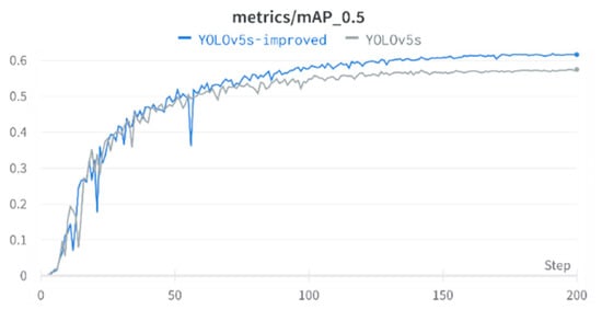 In this paper, the YOLOv5s model is selected and trained under Ubuntu 18.04 operating system (Dell Co., Ltd., Beijing, China) with the deep learning framework Pytorch 1.12.0, and the image processor (GPU) is NVIDIA GeForce GTX TITAN X (12GB video memory). Using the default hyperparameters of the YOLOv5s network, the training and test image sizes were set to 640 × 640, the batch size used for the model was set to 16, and the number of training epochs was set to 200. The training process is shown in Figure 6, and the accuracy of the model gradually increases until convergence as the number of epochs increases. In Figure 6, YOLOv5s represents the original model, and YOLOv5s-improved represents the model with the addition of small object detection layer. It can be seen from the figure that the accuracy of the improved model is higher than that of the original model. The Precision–Recall curves of YOLOv5s and YOLOv5s-improved are shown in Figure 7.