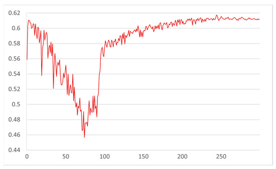 The pruning coefficient is set to 0.005, and the model with the addition of the small object detection layer is trained sparsely. As shown in Figure 8, with the sparse training of the model, the parameter of the BN layer gradually converges to 0. After 300 epochs of training, the model converged, and at this time most of the parameters of the BN layer converged to 0, indicating that there are indeed low-information channels in the network model, which lays the foundation for the channel pruning later. Figure 9 shows the changes in the model accuracy on the validation set during the sparse training process. It can be seen that the accuracy of the model gradually decreases between 0 and 80 epochs, which corresponds to the process that the parameters of the BN layer converge to 0 rapidly in Figure 8; in the subsequent 220 epochs, the distribution of the parameters of the BN layer no longer changes significantly, while the the accuracy of the model also gradually rises and returns to the original value until convergence. After the sparse training, the pruning ratio is set to 0.3 for channel pruning, and the pruned model is fine-tuned for training to obtain the final lightweight model.