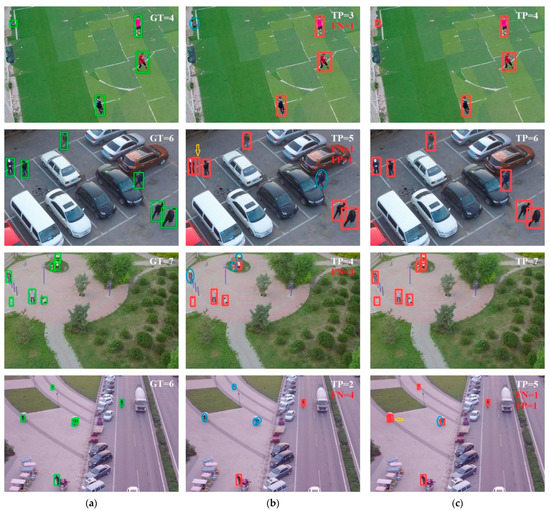The detection results of different methods: (a) ground truth; (b) original YOLOv5s; (c) YOLOv5s_P2+ compression. The ground truths are marked by green boxes. Prediction results are marked by red boxes. The missed detections are marked by blue ellipses. The false detections are marked by yellow arrows. GT means the number of ground truths. TP means the number of right detections. FN means the number of missed detections. FP means the number of false detections.