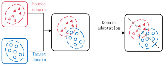 TL is a method of using existing knowledge to solve problems in different but related fields. Under variable conditions, TL plays a vital role. The operating conditions of mechanical equipment will change facing different fault diagnosis fields. The fault signal data distribution is different under various working conditions, which are defined as different domains. The case where the data are labeled is defined as the source domain , which includes samples. is the label of sample , is the label domain, which has healthy states. The source domain sample belong to sample space , and data obeys marginal probability distribution . Data unlabeled conditions are defined as target domains , and contain samples to be classified. Target domain sample belongs to sample space , and data obey marginal probability distribution . Through the source domain fault diagnosis knowledge to assist the training of the target domain diagnosis model, the source domain and the target domain should satisfy the following relationship: The label space of the source domain data needs to contain the label space of the target domain data : ; the source and target domains have different data distribution, , so the fault diagnosis model of the source domain cannot be directly applied to the fault diagnosis problem of the target domain, which may lead to misjudgment of the health status of the mechanical equipment. In view of the above-mentioned domain difference problem, as shown in Figure 1, domain adaptation, through the fault diagnosis knowledge of the source domain, assists the target domain to identify the health status of the equipment, which can solve the problem of fault diagnosis for unlabeled target domains. This paper aims to build a deep transfer diagnosis model, adapt the data distribution of mechanical equipment in the source domain and the target domain, and realize the reuse of fault diagnosis knowledge from the source domain to the target domain.