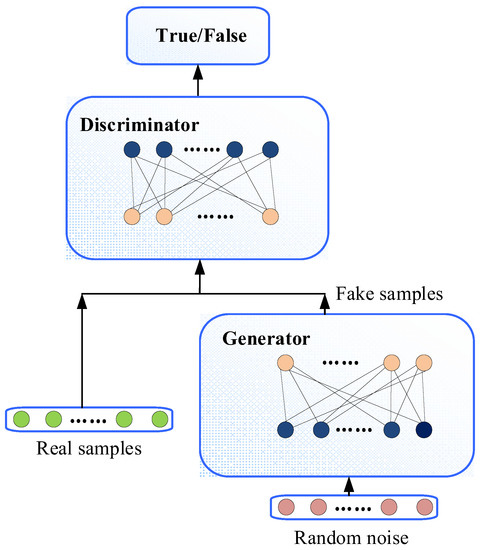 The GAN is a generative model based on adversarial theory. Specifically, the network contains two parts, i.e., a generator and a discriminator. The purpose of the generator is to learn the distribution law of real data samples and generate new data samples. The purpose of the discriminator is to determine whether the data come from the generator or the real data sample. These two pairs are continuously optimized in the confrontation and finally reach a balance. The basic composition framework of GAN is shown in Figure 2.