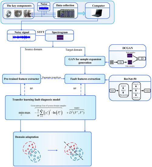 Firstly, the measured one-dimensional fault vibration signal is converted into a two-dimensional image signal through the short-time Fourier transform (STFT). Once the dataset is established, a deep convolutional generative adversarial network (DCGAN) is used to extract the fault characteristic information of the target domain and generate similar fake samples to expand the target domain dataset. Then, transfer fault features in the source domain and target domain data are extracted by Resnet-50. Finally, the training process of Resnet-50 is constrained by domain adaptation regularization to form a deep transfer diagnosis model of mechanical faults, which reduces the distribution difference between the transfer fault features in the extracted source domain and target domain data. The fault diagnosis knowledge of the source domain equipment can be used to identify the health status of the target domain equipment. The overall block diagram of the proposed method is shown in Figure 3.