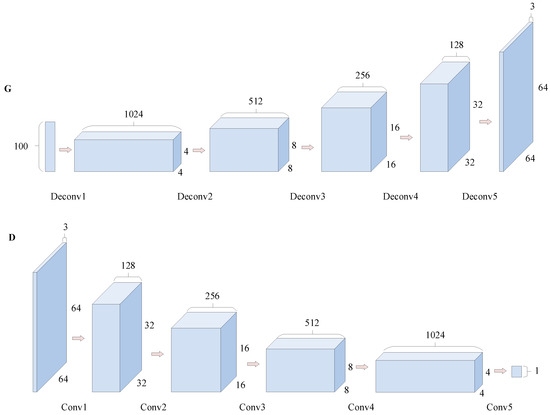 The generator and discriminator of the original GAN are both composed of a multilayer perceptron (MLP), which cannot show better ability of image feature extraction. To make the extracted image feature more representative, a CNN is employed as a network model of the generator and discriminator, which is called DCGAN [33]. In DCGAN, the discriminator model is mainly composed of convolutional layers, and the generator model is mainly composed of transposed convolutional layers, as shown in Figure 4.