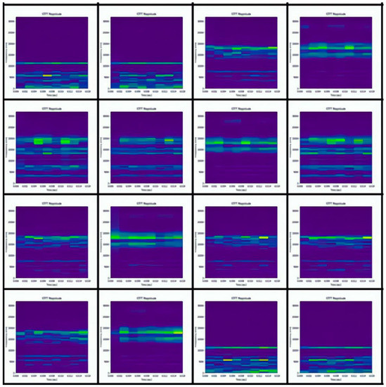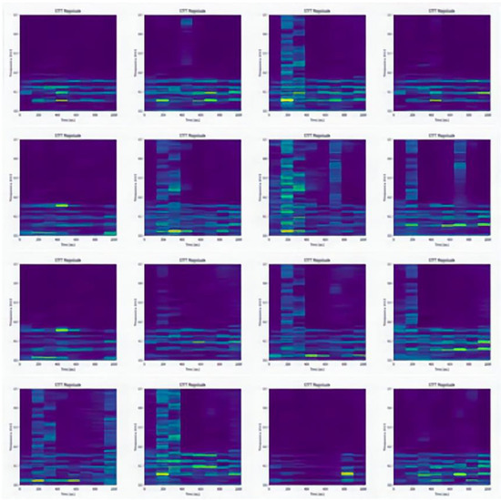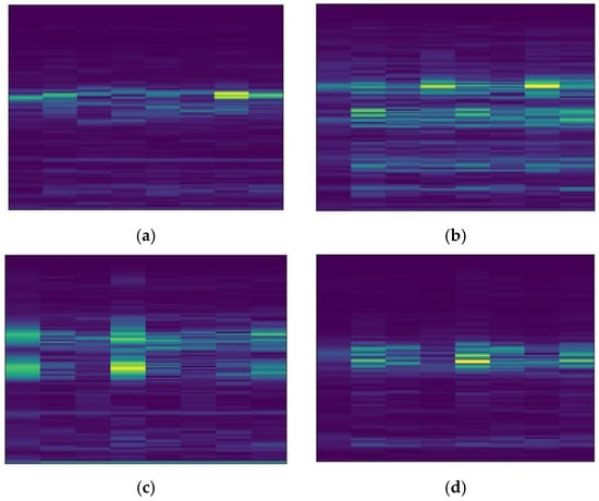 The datasets collected under four different load conditions are defined as domains A, B, C, and D, respectively. There are 2000 samples in each domain, including 10 different health states, 200 samples for each state, and each sample contains 1024 sampling points. The configuration information of the samples in each domain is shown in Table 2. The short-time Fourier transform is used to convert the one-dimensional vibration signal in the dataset into a two-dimensional spectrogram. Figure 6 shows the spectrogram of four different label samples in domain A.