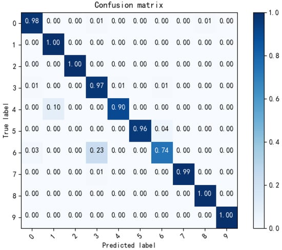 This subsection uses the Paderborn University (PU) dataset [36] to perform fault diagnosis classification experiments under variable operating conditions. The experimental rig consists of five parts, from left to right, a test motor, measurement shaft, bearing module, flywheel, and load motor, as shown in Figure 10. As shown in Table 5, the test bench first collects bearing failure data in a base setting, setting the rotational speed to rpm, the load torque to Nm, and the radial force on the bearing to N. Then the radial force is changed to N, the load torque is changed to Nm, and the bearing vibration signals are collected for the other two work conditions. Two sets of tests, artificial damage and real damage, were conducted on the inner and outer race of the bearing under each working condition. Therefore, there are nine different categories of vibration data in each working condition, including one normal state and eight fault states with different damage modes, different damage degrees, and different locations.