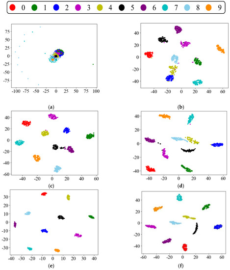 Visualization of the transferable features of task D→C using t-SNE. (a) Domain D original sample data; (b) CNN; (c) CNN + MMD; (d) Resnet-50; (e) proposed method-source domain; (f) proposed method-target domain.