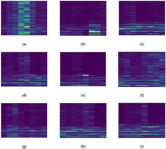 Spectrograms of 9 different labeled samples in domain A. (a) K001; (b) KA01; (c) KA03; (d) KA15; (e) KA16; (f) KI05; (g) KI07; (h) KI17; (i) KI18.