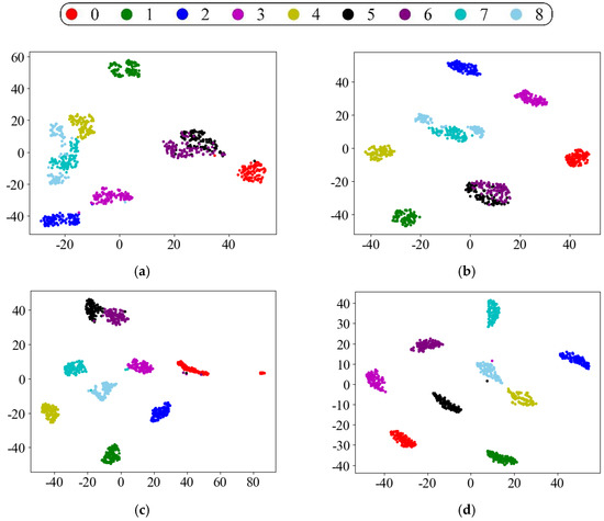 Visualization comparison of each method’s fault characteristics in Task C→A. (a) CNN; (b) CNN + MMD; (c) ResNet; (d) proposed method.