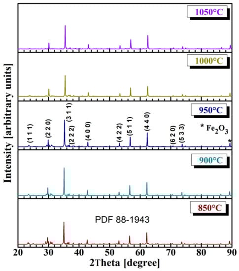 Our analysis of the XRD spectra (see Figure 1) showed that 120 min treatment and an annealing temperature of 850 °C were enough to form a cubic spinel structure in the magnesium-tungsten ferrite. The peaks were in close agreement with the powder diffraction data from ICDD/JCPDS corresponding to cubic spinel ferrite structures (PDF 88-1943). Figure 1 shows that all samples mainly contained the Mg0.5W0.5Fe2O4 spinel phase, and the (311) peak displayed the strongest reflection. Increasing the annealing temperature diminished the quantity of Fe2O3. According to the literature on the substitution of Mg metallic ions with other metallic ions [,], it seems that tungsten metallic ions favor ferrite formation at an annealing temperature of below 1050 °C. The X-ray diffraction results of the magnesium-tungsten spinel ferrite, i.e., concerning reflections on lattice planes, are in accordance with other reported data on the preparation of magnesium ferrite [,,,].