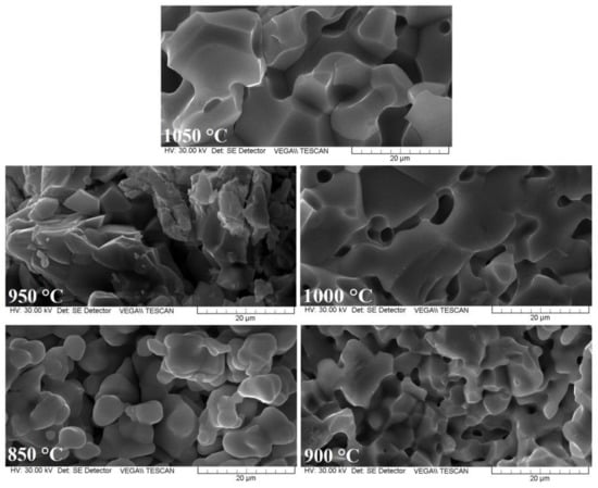 SEM micrographs were obtained at room temperature by breaking the samples. It was found that the samples annealed at 850 °C and 900 °C for 120 min showed fine granulation, with crystallites of spherical shape and closed intra-granular porosity. These characteristics were confirmed by observed variations of relative permittivity and electrical resistivity based on relative humidity. As can be seen in Figure 2, the sample annealed at 950 °C showed clusters of micrometric crystallites with average size of 1.5 μm. These results were validated by the relative permittivity behavior of the sample, compared with that of the samples annealed at 850 °C and 1000 °C temperatures. The ferrite annealed at 1000 °C showed crystallites faceted with a higher average size, i.e., 2.7 μm, while the ferrite annealed at 1050 °C showed crystallites with an average size of 3.5 μm (see Figure 2).