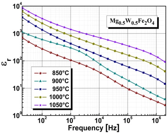 Dielectric investigations of magnesium tungsten ferrite samples (disks) were performed at room temperature using a Wayne Kerr 6400P model impedance phase analyzer in a frequency range of 20 Hz–20 MHz. The relative permittivity and electrical resistivity were mainly dependent on the exchange mechanism between metallic ions located at tetrahedral or octahedral sites [,]. The frequency variation of permittivity and resistivity evidenced both the particularity of this exchange mechanism and the influence of crystallite distribution inside the network structure of the ferrite. Figure 3 summarizes the electrical characteristics of relative permittivity variation, determined in the absence of humidity with an alternating current regime in a frequency range 20 Hz–20 MHz, for magnesium-tungsten ferrite samples annealed at different temperatures. The electrical properties were strongly affected by the stoichiometry, impurities, porosity, annealing temperature and humidity. As can be seen in the graphical representation, the relative permittivity of the samples depended on the annealing temperature and crystallite size. Increasing the annealing temperature led to an increase in the relative permittivity of the samples. The sample annealed at 850 °C showed the minimum value of relative permittivity while the sample annealed at 1050 °C showed the maximum value. This was due to the fact that samples annealed at lower temperature have lower density, lower crystallite size etc. As can be seen in Figure 3, the relative permittivity of magnesium-tungsten ferrite is heavily dependent on frequency, showing a decrease of about two to three orders of magnitude for the frequency range 20 Hz–20 MHz, according with Maxwell-Wagner and Debye relaxation mechanism. Similar relative permittivity behavior has been reported in the literature [,,,].