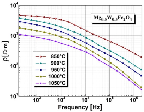 The electrical resistivity of the analyzed samples is summarized in Figure 4. In this study, we found that electrical resistivity strongly depends on annealing temperature and frequency. In the case of the sample annealed at 850 °C, higher resistivity was observed compared with the sample annealed at 1050 °C. This phenomenon is due to the increase in the size of and the diminution of the space between the crystallites, which implies a significant contribution of the intrinsic conduction mechanism in ferrite materials.
