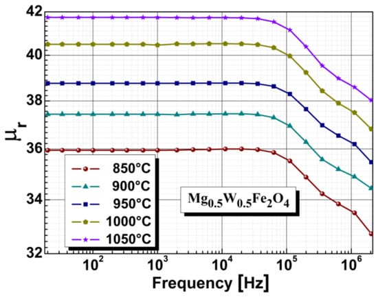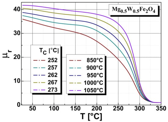 Magnetic measurements were performed on the torus shaped samples at room temperature using an Wayne Kerr 6400P impedance phase analyzer at a frequency range 20 Hz–20 MHz. To evidence the impact of annealing temperature on magnesium-tungsten ferrite, we observed the evolution of two relevant magnetic parameters: relative permeability and Curie temperature. As can be seen in the graphical representation in Figure 5, the relative permeability depends on the annealing temperature. The minimum value of ferrite relative permeability was observed in the sample annealed at 850 °C, while the maximum value was found for the sample annealed at 1050 °C. From Figure 5, we can conclude that increasing the annealing temperature has the effect of increasing the relative permeability of the ferrite. Additionally, for the frequency range of 20–106 Hz, we found that the relative permeability was constant for all samples. Similar results were reported in [].