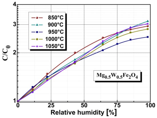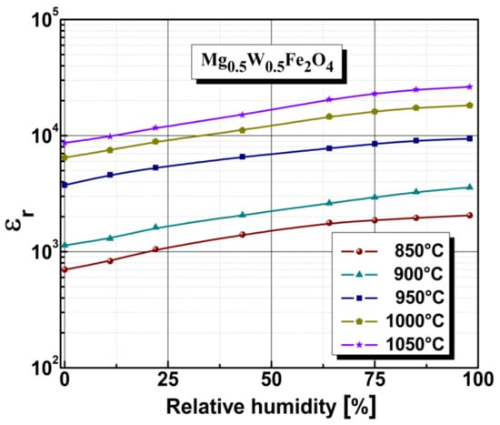Humidity is a key factor influencing the behavior and electric characteristics of ferrites. The mechanism of humidity sensitivity for ferrites is based on the effect of water molecules, which are adsorbed on the material surface, changing the conductivity of the material. It is very significant to investigate how relative humidity influences the relative permittivity and electrical resistivity of ferrites. The influence of relative humidity on the Mg0.5W0.5Fe2O4 ferrite samples was measurement in a closed enclosure at a constant temperature of 25 °C using humidity values in the range 0–98% RH, as determined with an RLC meter at 1 kHz fixed frequency. The relative permittivity under the influence of humidity is summarized in Figure 7. As shown, the infiltration of water vapor into the ferrite has the effect of increasing the relative permittivity.