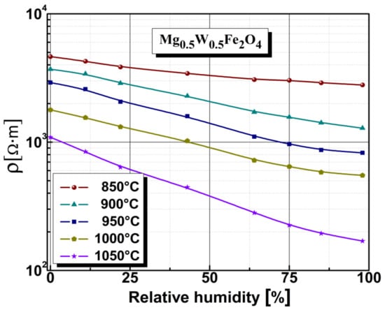 The resistive sensitivity of a humidity sensor based on Mg0.5W0.5Fe2O4 ferrite, depending on annealing temperature and humidity, is represented in Figure 8. The magnesium-tungsten spinel ferrite showed an electronic conduction mechanism due to humidity, which was reflected in the electrical resistivity (see Figure 8). In this study, we found that electrical resistivity was strongly dependent on the humidity level, with resistivity decreasing by approximately one order of magnitude when humidity increased from 0 to 98% RH.