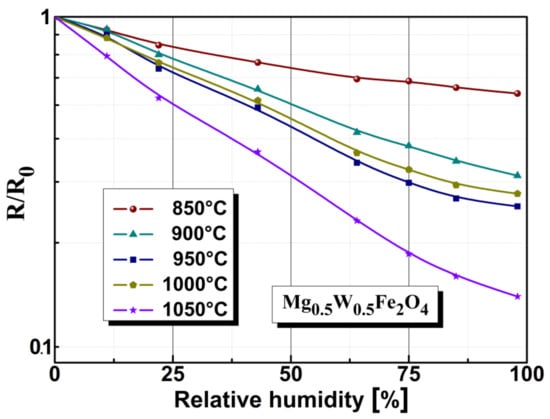 As shown in Figure 10, in the case of the ferrite sample treated at 1050 °C, the R/R0 coefficient showed the best sensitivity to humidity. This was attributed to the large number of open pores that were interconnected with each other, compared to those in the other samples. In the case of magnesium-tungsten ferrite, there was a clear correlation between annealing temperature and the degree of open porosity.