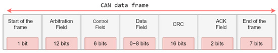 The CAN was introduced for vehicles in 1986 by Robert Bosh GmbH [27]. The actuator, sensor, controller, and other nodes from real-time applications are the main components that communicate with one another [28]. The CAN bus protocol involves the use of a broadcast mechanism that sends data/messages to all nodes of the network. Multiple CAN buses can be found in modern vehicles. Each bus can perform a variety of functions, such as engine control and brake control [29]. One of the primary benefits of the CAN system is the ability to add nodes without requiring complex programming. This has facilitated the process of integrating external systems with it, and it will continue to function normally, as before integration. Another benefit of the CAN system is fault detection that can be done with extreme precision. It also has a fault confinement feature that allows it to shut down automatically if severe errors occur. If one node fails, the others will continue to function normally [30].