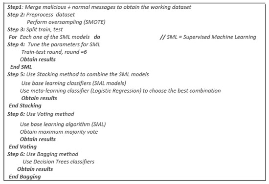 The workflow is illustrated in Figure 2. First, we merged the malicious and benign messages into a single dataset. The data were then cleaned and preprocessed, including oversampling for data balancing. Then, a variety of ML classification models were utilized. Finally, the classification models were evaluated by using well-known evaluation metrics.